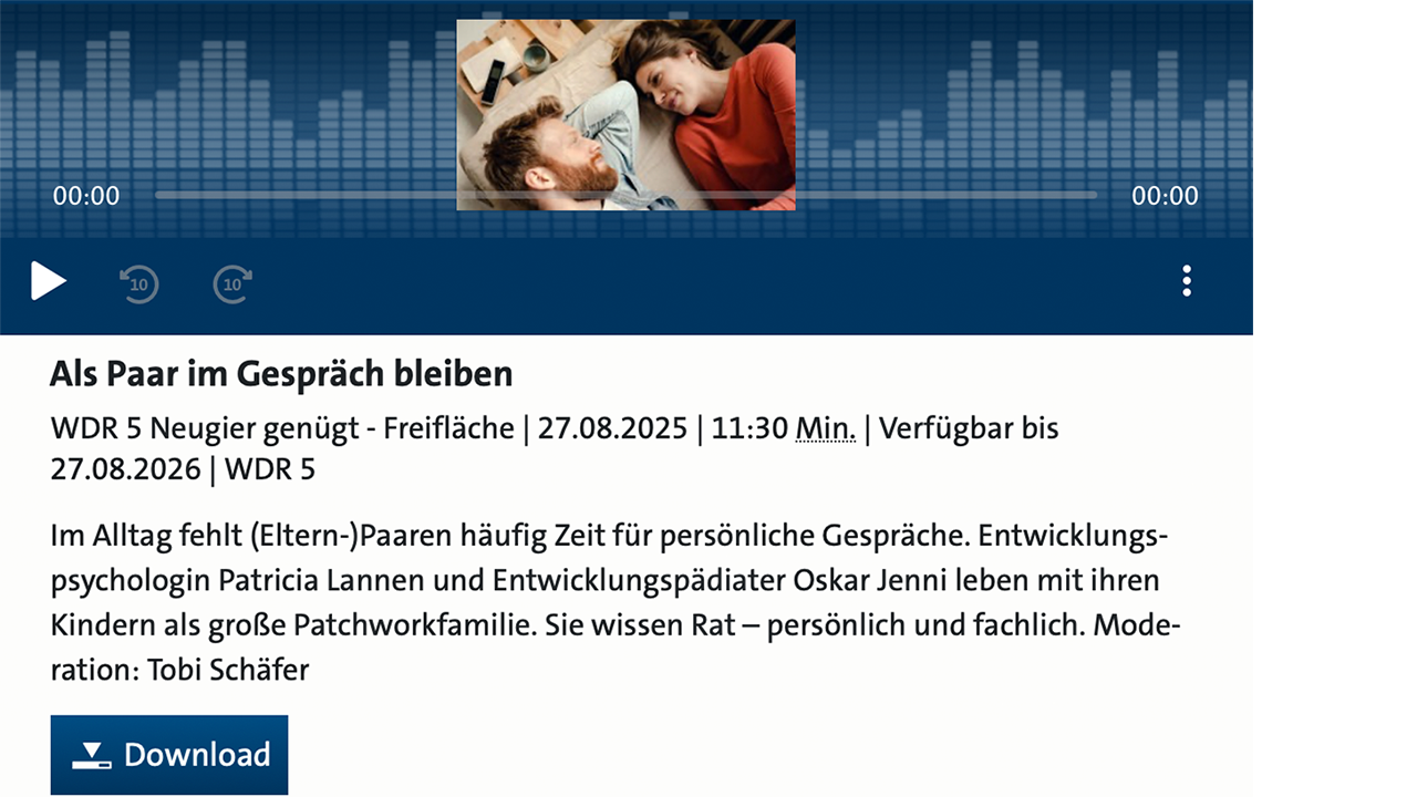 Interview mit Patricia Lannen und Oskar Jenni zum Buch «Miteinander reden» in der Sendung «WDR 5 Neugier» vom 27.08.2025. Interview zum Nachhören verfügbar bis am 27.08.2026